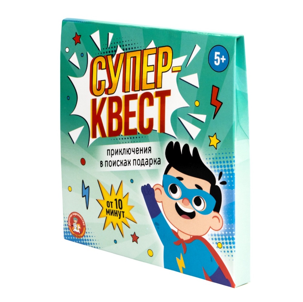 Настольная игра для детей «Суперквест. Приключения в поисках подарка» - интересный квест, в ходе которого ребенку нужно пройти 7 испытаний и найти подарок! Состав игры: - карточки с заданиями (9х9 см) - 7 шт. - инструкция. Для детей старше 5 лет. Размер 2х15х15 см