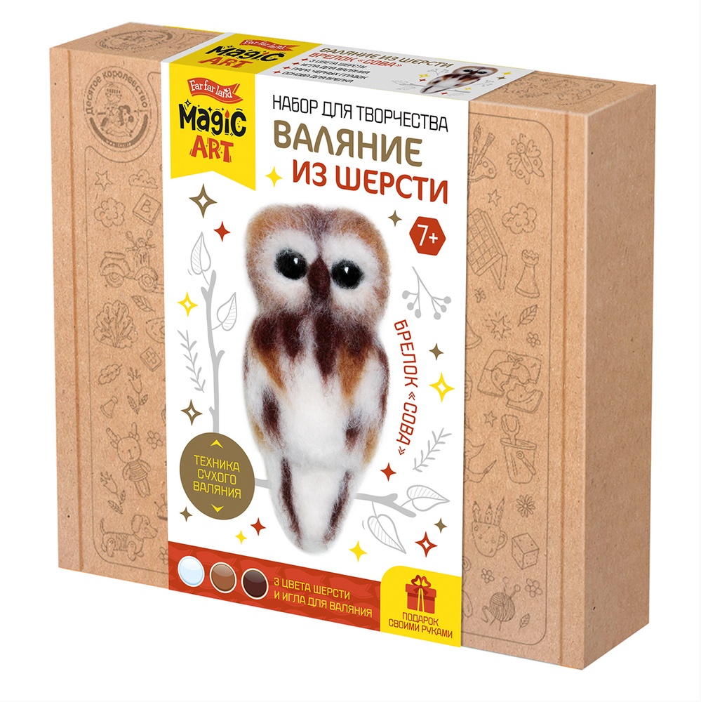 Валяние - особая техника рукоделия , в процессе которой из шерсти для валяния создаётся рисунок на ткани, объёмные игрушки, декоративные элементы или аксессуары. Для валяния используется только натуральная шерсть. Набор для валяния Сова включает все необходимое для создания игрушки или брелока из шерсти. Состав: - шерсть для валяния - 3 цвета; - игла для валяния металлическая - 2 шт.; - глазки из пластика - 2 шт., - лента-липучка, - штифт - основа для брелока, - инструкция. Набор рекомендован для детей старше 7 лет. Размер 4х24х21 см